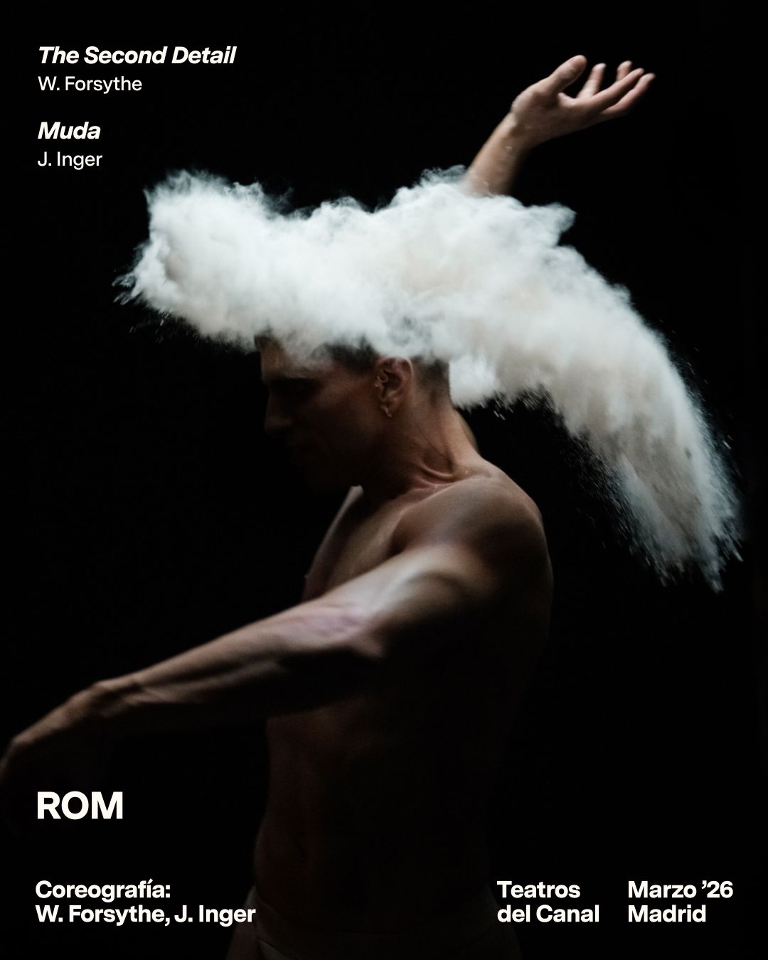 In the Sala Roja of the Teatros del Canal, between March 12, 13, 14 (8:00 PM) and 15 (6:30 PM), 2026, the Company will premiere two new works that make up the ROM (Range of Motion) program, a program that proposes a journey into the memory of movement that begins with the abstract, algorithmic language of William Forsythe in The Second Detail and ends with the expressionist and dramaturgical heritage of Muda by Johan Inger.